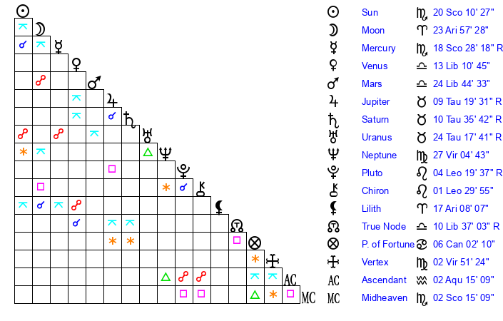 | Neptune | 27 Virgo 5 | 29 Pisces 34 | 27 Virgo 19 |