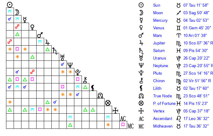 Moon | 3 Sagittarius 48 | 6 Taurus 15 | 25 Capricorn 17 |