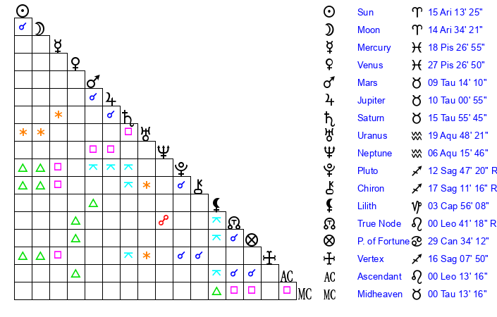 Sun | 15 Aries 14 | 15 Aries 10 | 9 Taurus 40 |