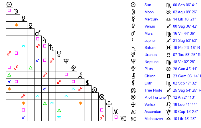 | Sun | 0 Scorpio 6 | 0 Scorpio 32 | 0 Aquarius 15 |