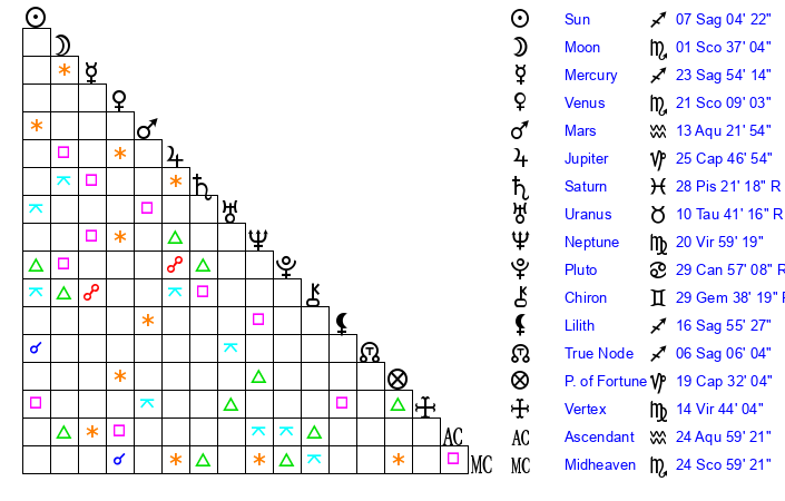 | Moon | 1 Scorpio 34 | 25 Pisces 25 | 14 Capricorn 28 |