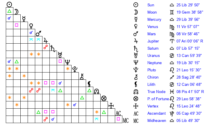| Neptune | 19 Libra 30 | 0 Aries 3 | 21 Libra 34 |