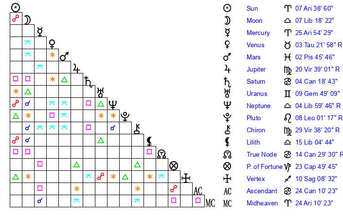 | Moon | 7 Libra 14 | 27 Pisces 47 | 15 Virgo 27 |