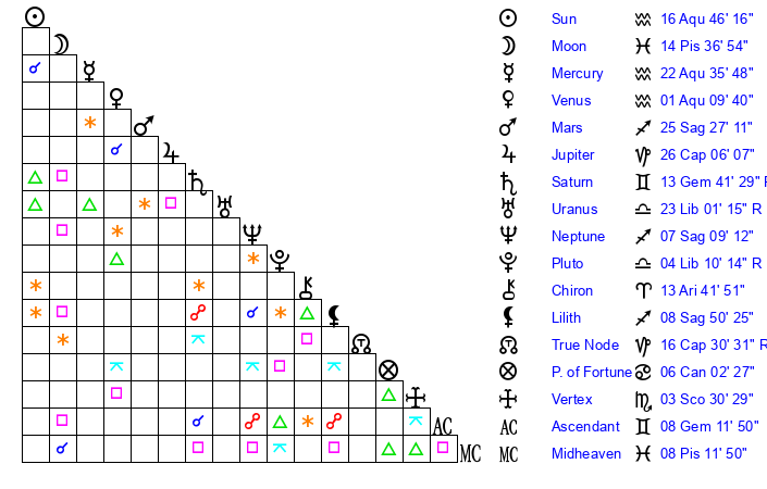 | Mercury | 22 Aquarius 36 | 14 Aquarius 22 | 15 Pisces 15 |