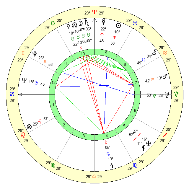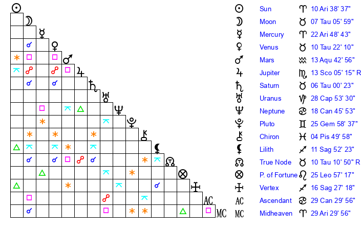 Moon | 7 Taurus 6 | 24 Taurus 47 | 11 Cancer 36 |