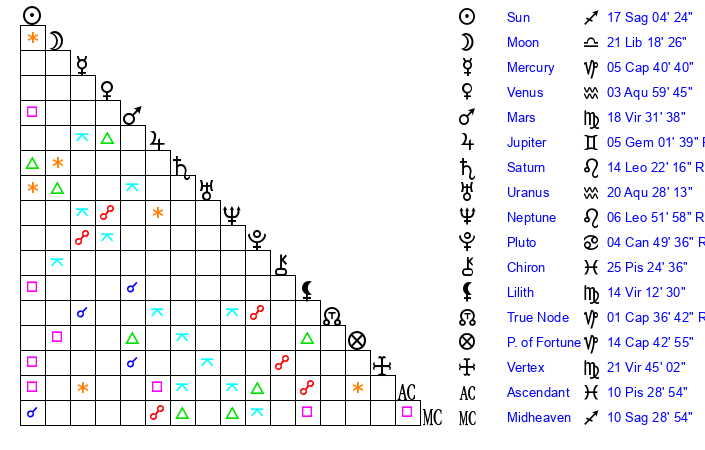 | Sun | 17 Sagittarius 4 | 18 Sagittarius 7 | 5 Aries 13 |