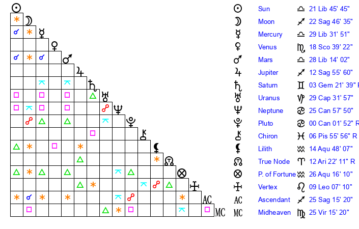 Sun | 21 Libra 46 | 22 Libra 23 | 16 Aquarius 6 |
