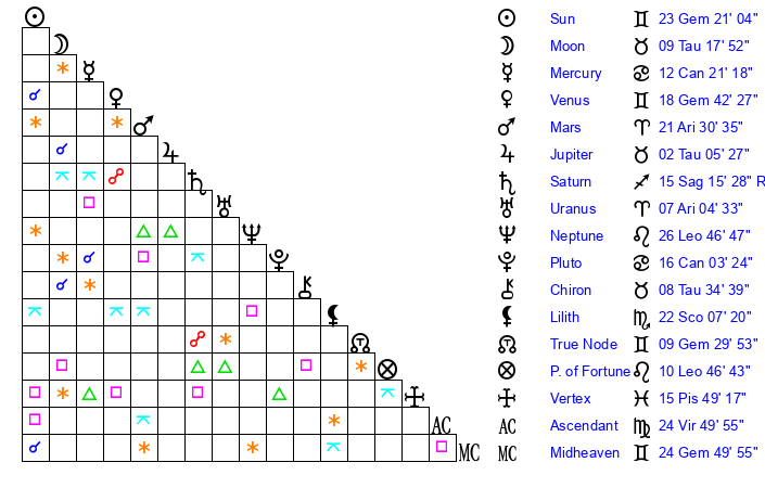| Sun | 23 Gemini 21 | 23 Gemini 53 | 26 Virgo 29 |