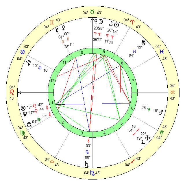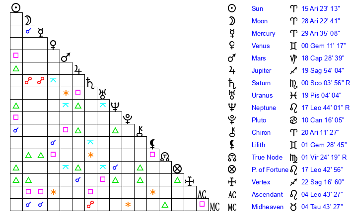 | Neptune | 17 Leo 43 | 0 Aries 13 | 19 Leo 4 |