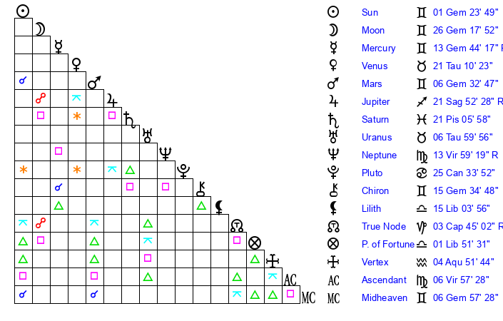| Jupiter | 21 Sagittarius 39 | 25 Gemini 57 | 14 Sagittarius 29 |