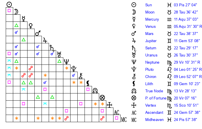 | Sun | 3 Pisces 27 | 4 Pisces 19 | 25 Taurus 11 |