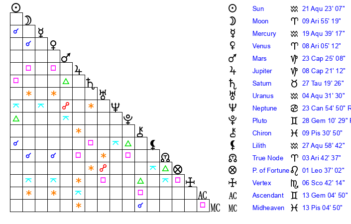 Mercury | 19 Aquarius 39 | 23 Aquarius 8 | 12 Gemini 25 |