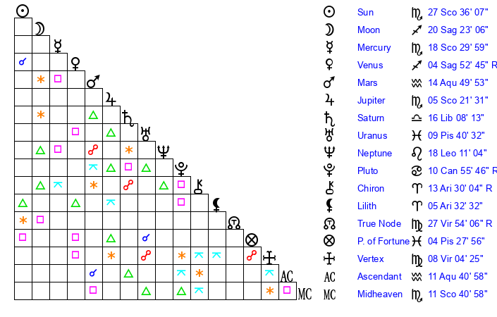 | Sun | 27 Scorpio 36 | 28 Scorpio 52 | 11 Pisces 6 |