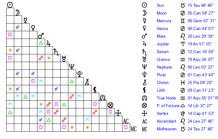 | Venus | 0 Cancer 43 | 3 Aries 42 | 16 Cancer 4 |