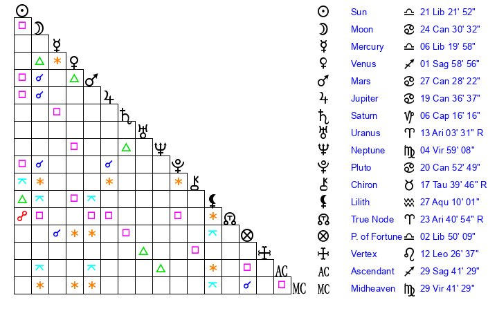 | Moon | 24 Cancer 24 | 13 Leo 16 | 23 Capricorn 45 |