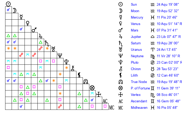 | Saturn | 19 Aquarius 37 | 18 Pisces 47 | 27 Aquarius 51 |