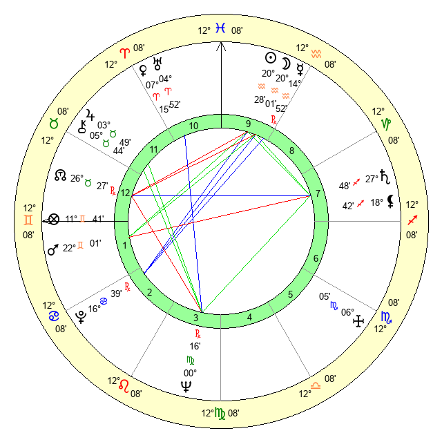 | Moon | 20 Aquarius 4 | 16 Cancer 46 | 6 Virgo 0 |