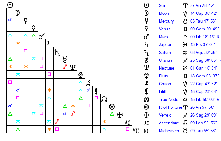 | Moon | 14 Capricorn 24 | 1 Capricorn 18 | 26 Gemini 46 |