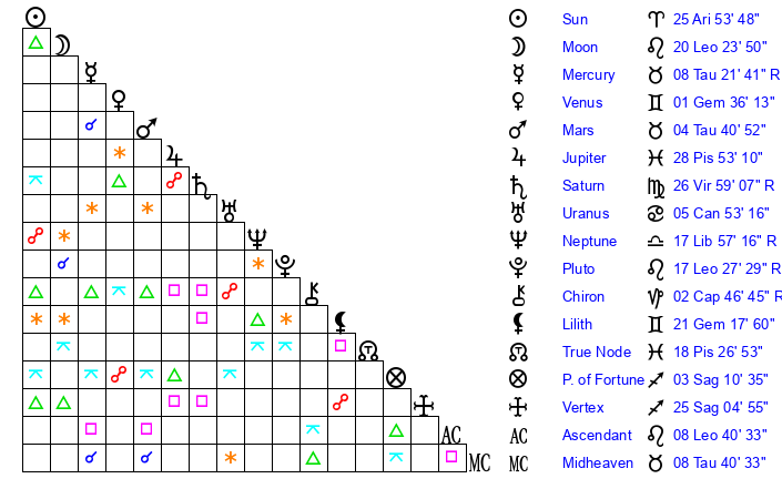 | Moon | 20 Leo 18 | 7 Sagittarius 6 | 16 Taurus 31 |