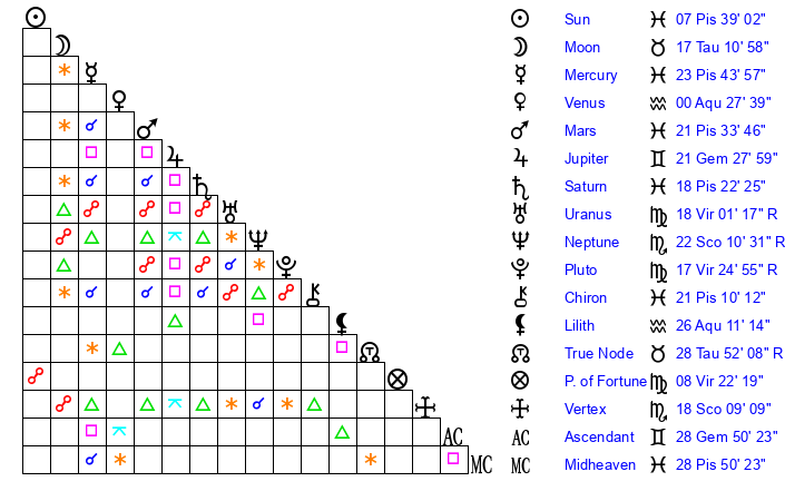Sun | 7 Pisces 39 | 8 Pisces 21 | 6 Taurus 0 |