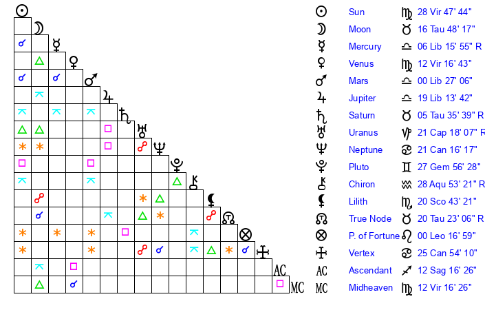 | Sun | 28 Virgo 48 | 29 Virgo 56 | 24 Capricorn 27 |