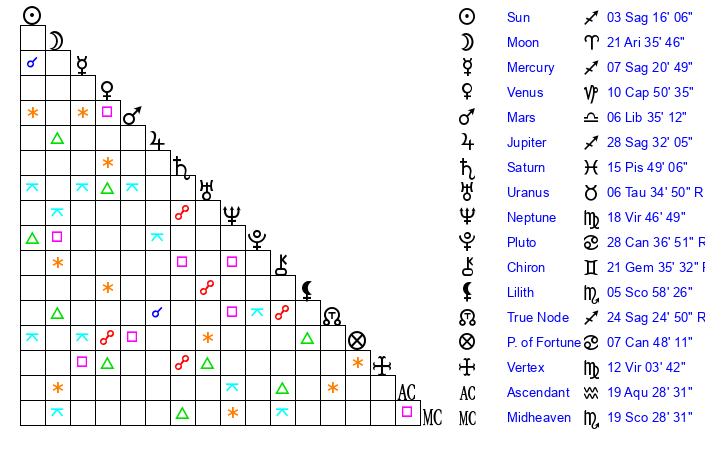 | Moon | 21 Aries 44 | 3 Aquarius 30 | 1 Leo 47 |