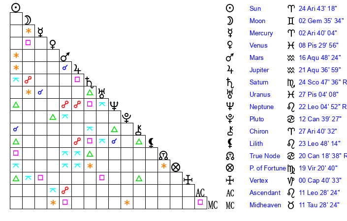 | Saturn | 25 Scorpio 19 | 26 Pisces 5 | 19 Scorpio 55 |