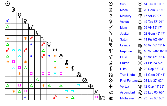 Sun | 14 Taurus 1 | 14 Taurus 29 | 11 Cancer 32 |