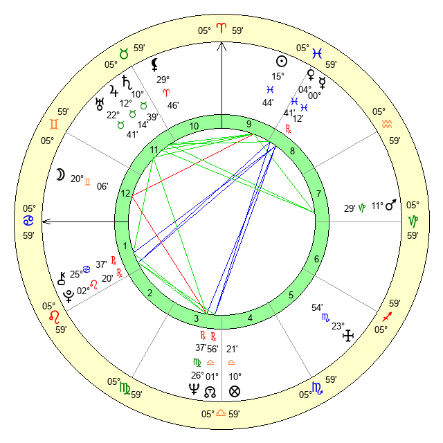 | Moon | 19 Gemini 57 | 16 Gemini 40 | 17 Cancer 20 |