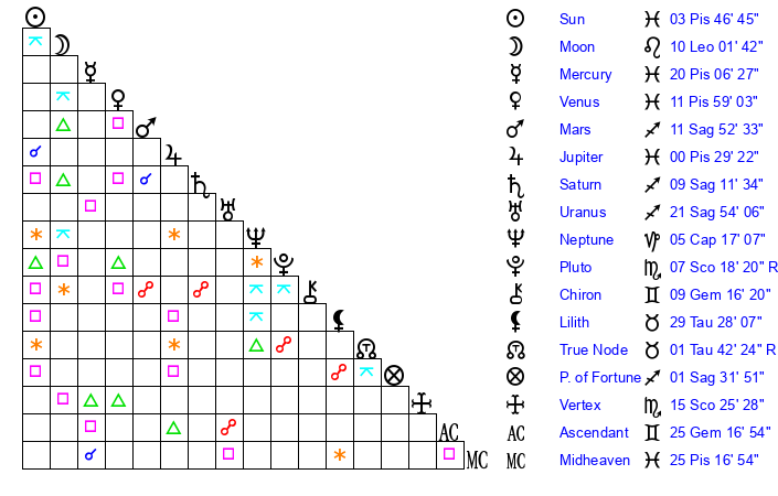 | Sun | 3 Pisces 47 | 4 Pisces 19 | 12 Aries 39 |
