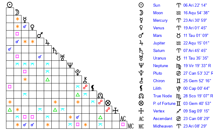 | Moon | 16 Aquarius 44 | 12 Pisces 58 | 20 Aries 18 |