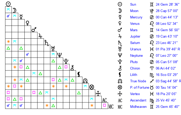 | Sun | 24 Gemini 28 | 25 Gemini 48 | 6 Libra 28 |