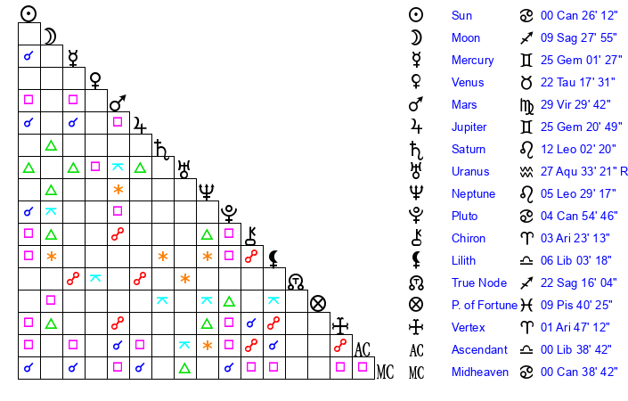 | Sun | 0 Cancer 26 | 1 Cancer 31 | 13 Libra 36 |