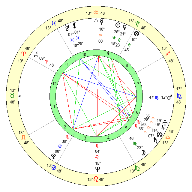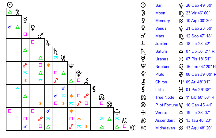 | Moon | 23 Virgo 32 | 12 Virgo 30 | 21 Gemini 7 |
