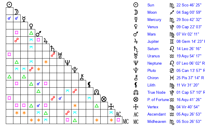 | Sun | 22 Scorpio 46 | 23 Scorpio 49 | 11 Pisces 19 |