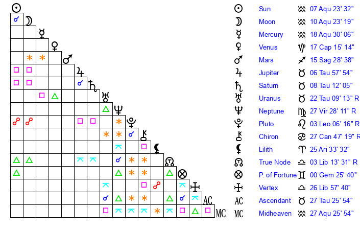 | Sun | 7 Aquarius 23 | 8 Aquarius 1 | 1 Taurus 11 |