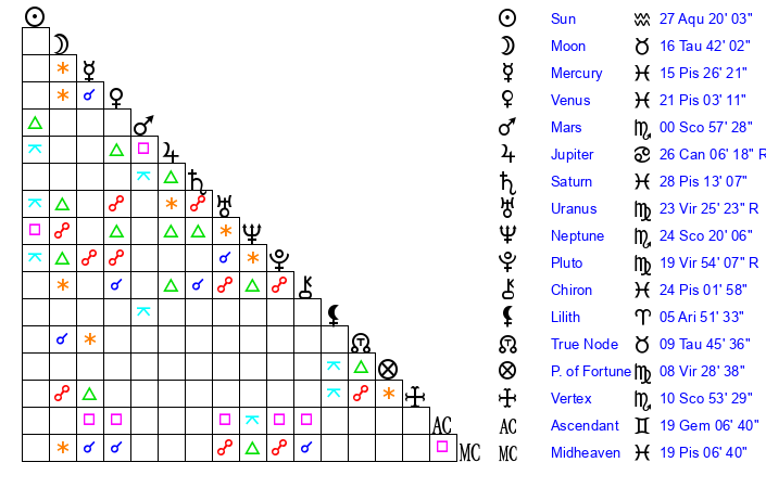 Pluto | 19 Virgo 54 | 2 Aquarius 32 | 18 Virgo 27 |