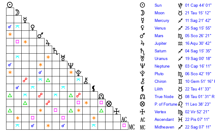 Sun | 1 Capricorn 44 | 2 Capricorn 17 | 11 Aquarius 27 |