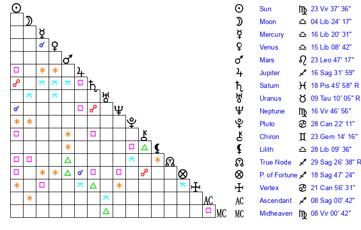 | Sun | 23 Virgo 37 | 24 Virgo 5 | 22 Sagittarius 33 |
