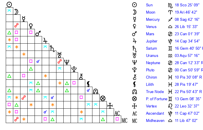 | Sun | 18 Scorpio 25 | 19 Scorpio 30 | 10 Pisces 59 |