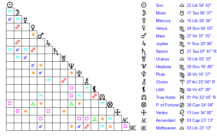 | Saturn | 21 Taurus 22 | 26 Pisces 32 | 17 Taurus 13 |