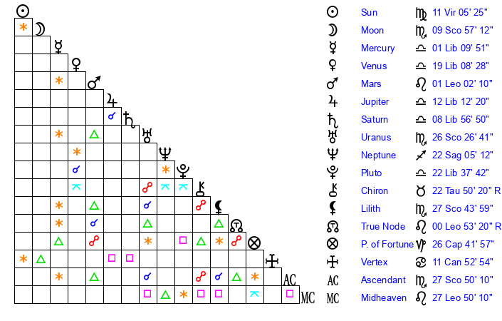| Saturn | 9 Libra 18 | 29 Pisces 42 | 14 Libra 36 |