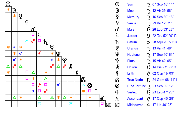 Neptune | 17 Scorpio 11 | 27 Pisces 31 | 19 Scorpio 15 |
