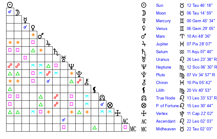 Moon | 6 Taurus 19 | 3 Leo 9 | 26 Leo 16 |