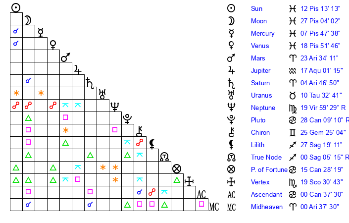| Sun | 12 Pisces 13 | 13 Pisces 7 | 7 Gemini 24 |