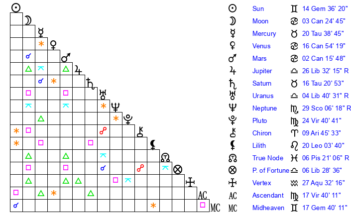 Sun | 14 Gemini 36 | 15 Gemini 17 | 7 Leo 6 |