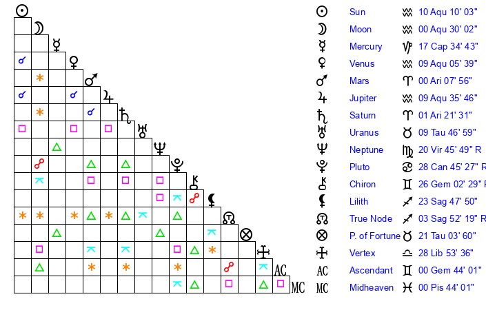 | Sun | 10 Aquarius 10 | 11 Aquarius 3 | 6 Taurus 46 |