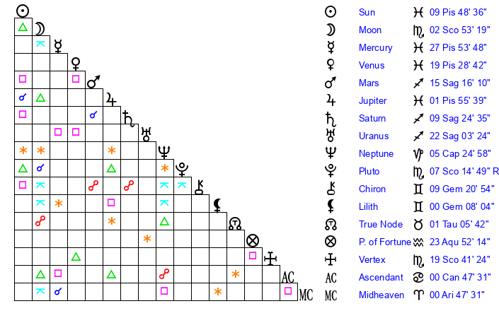 | Moon | 2 Scorpio 49 | 19 Pisces 32 | 12 Aries 11 |