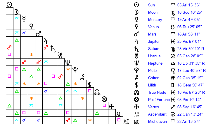 | Neptune | 18 Libra 31 | 29 Pisces 51 | 16 Libra 51 |