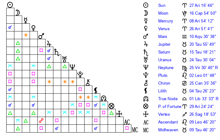 | Moon | 16 Capricorn 57 | 19 Sagittarius 7 | 12 Aquarius 17 |